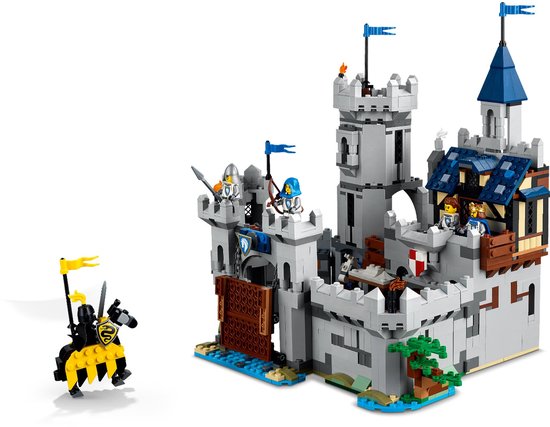 Laat kinderen kennismaken met leuke middeleeuwse actie met de set LEGO® Creator 3in1 Middeleeuws kasteel met ridders te paard (31168). Het gedetailleerde middeleeuwse kasteel kan open aan de achterkant en zit boordevol coole details, waaronder een ophaalbrug, een grote zaal, een stal, een smederij, een geheime schatkist, een koninklijke slaapkamer, een schrijfkamer en 2 torens.Jongens en meisjes vanaf 9 jaar hebben 3 bouwmogelijkheden: een kasteel, ridderspelen of een middeleeuws dorp met molen. Elke speelset bevat 6 minifiguren: een koning, kampioen, boogschutter en speerwerper te paard, een smid en een slangenridder, plus 2 verstelbare paarden.LEGO Creator 3in1 sets (apart verkrijgbaar) prikkelen de fantasie met 3 verschillende bouwmogelijkheden in elke doos, die aansluiten op de grootste passies van kinderen.